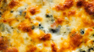 - Unte uma forma ou refratário, acrescente a massa e polvilhe com queijo ralado.